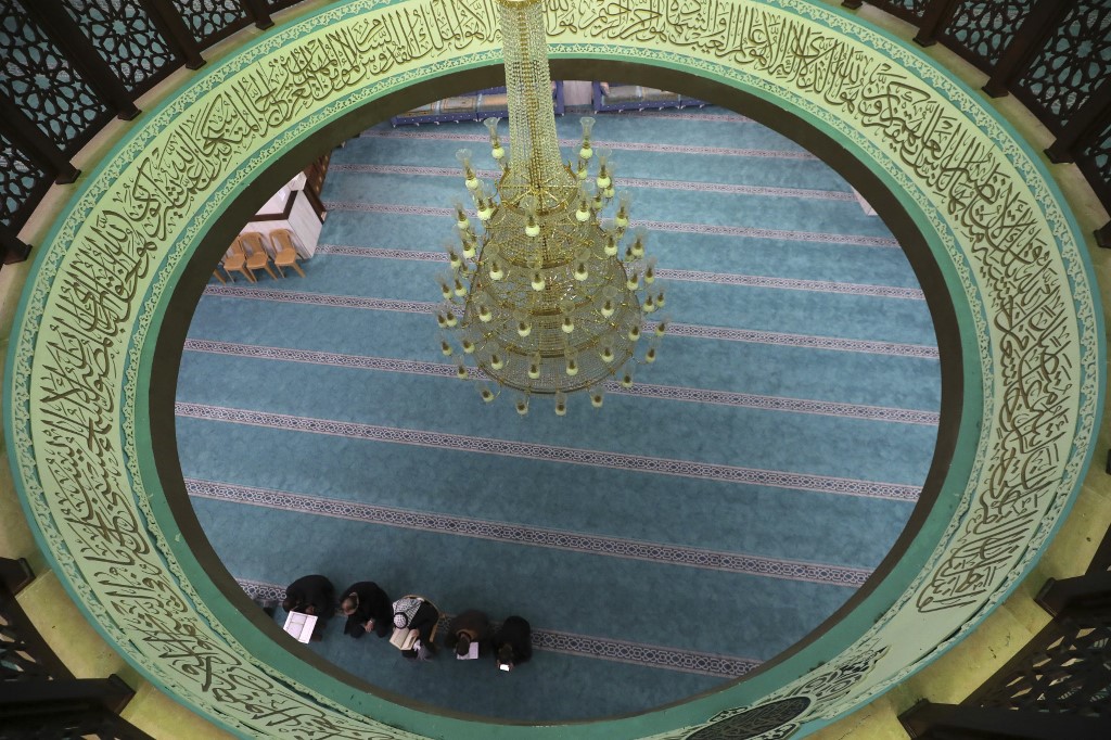 A few Palestinian worshippers pray at a mosque during the usually crowded weekly Friday prayers, in the midst of the coronavirus COVID-19 outbreak, in the West Bank town of Hebron on March 13, 2020. HAZEM BADER / AFP