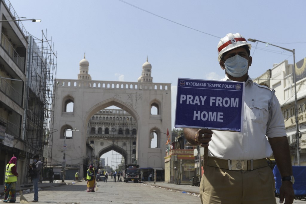 A traffic police personnel holds a placard on a deserted road during a one-day nationwide Janata (civil) curfew imposed as a preventive measure against the COVID-19 coronavirus, in Hyderabad on March 22, 2020. Nearly one billion people around the world were confined to their homes, as the coronavirus death toll crossed 13,000 and factories were shut in worst-hit Italy after another single-day fatalities record. NOAH SEELAM / AFP