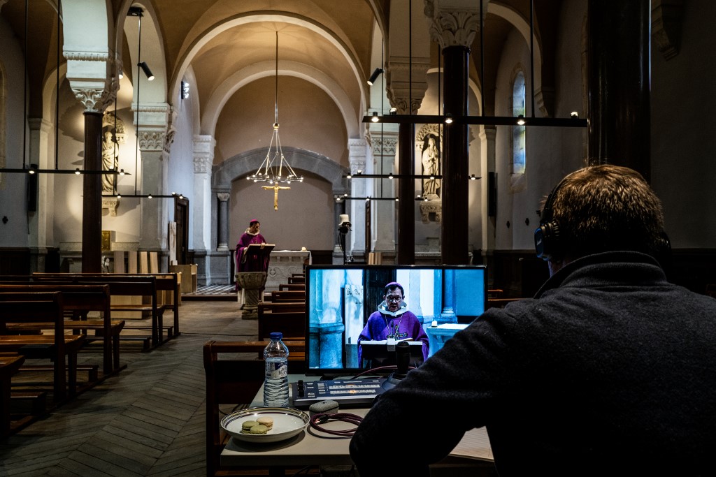 Auxiliary bishop of Lyon Emmanuel Gobilliard holds a streamed live Mass in the empty Saint-Irenee church, in Lyon, on March 24, 2020, on the eighth day of a lockdown aimed at curbing the spread of the virus. JEFF PACHOUD / AFP