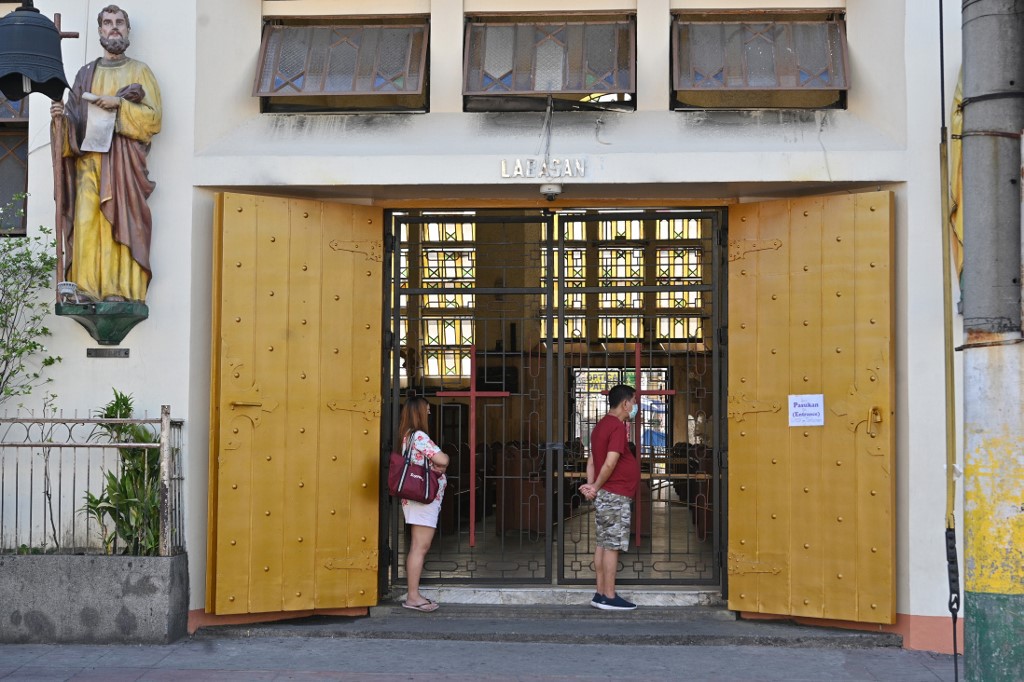 People wearing face masks stand and pray outside an empty Quiapo church, usually filled with devotees during Fridays but now closed due to restrictions to stop the spread of the COVID-19 coronavirus, in Manila on March 27, 2020. Catholic church authorities closed all its churches in line with the government's imposed enhanced quarantine as a preventive measure against COVID-19. Ted ALJIBE / AFP