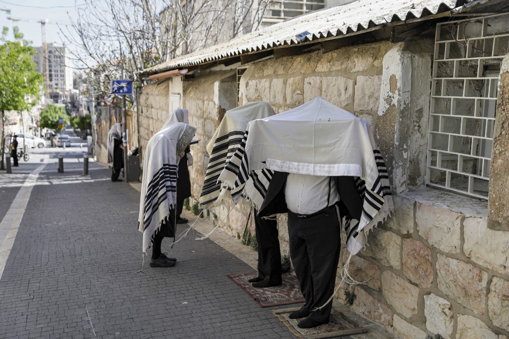 Ultra-Orthodox Jews, wearing the traditional Tallit Jewish prayer shawls, pray along a street outside their closed synagogue in Jerusalem on March 29, 2020, while keeping a distance of two metres from one another following instructions to stop the spread of the COVID-19 coronavirus pandemic. MENAHEM KAHANA / AFP