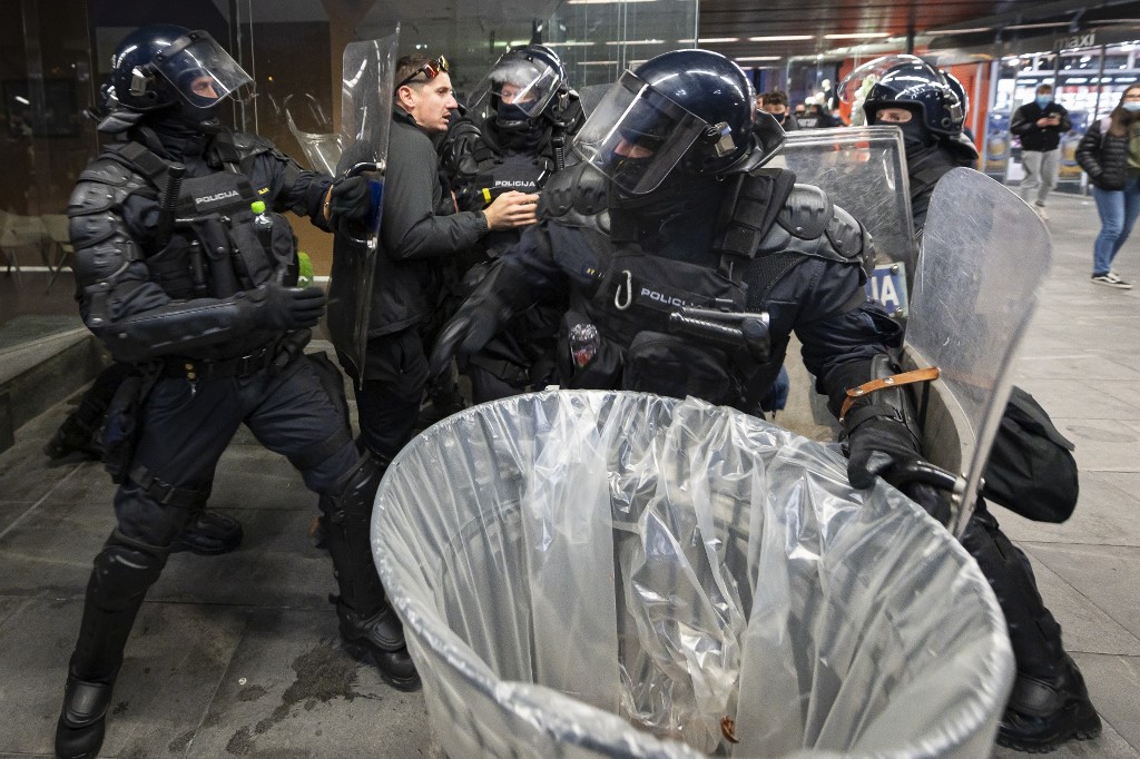 Police officers wearing riot gear grab a protester as they clash with police during the rally against government’s coronavirus restrictions in Ljubljana on November 5, 2020. Jure Makovec / AFP