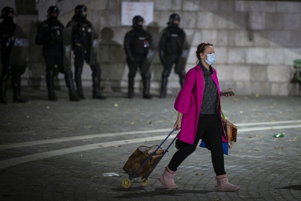 A woman with a shopping trolley walks past police officers wearing anti-riot gear as protesters clash with police during the rally against government’s coronavirus restrictions in Ljubljana on November 5, 2020. Jure Makovec / AFP