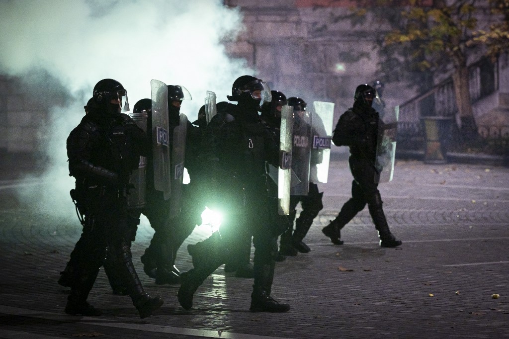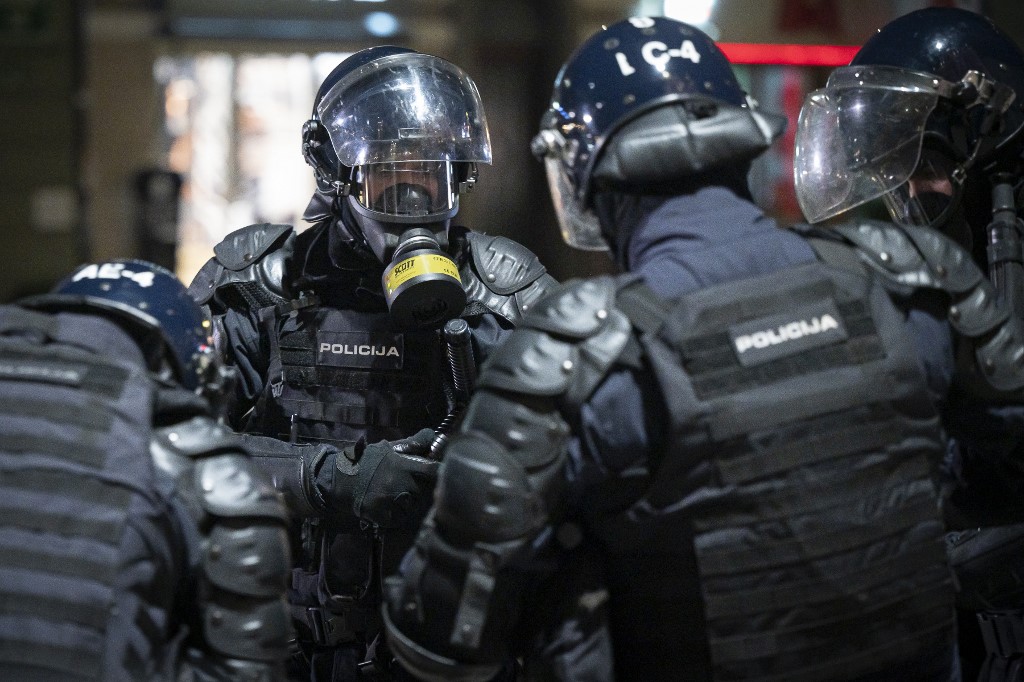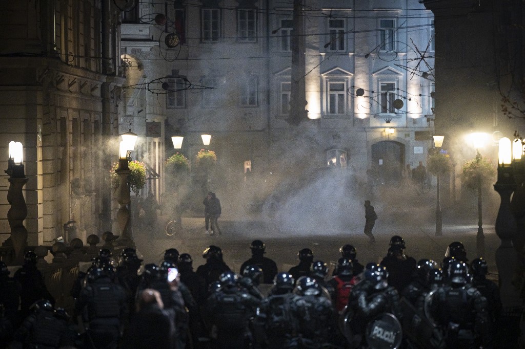 Police officers wear gas masks and anti-riot gear after firing tear gas against protesters as they clash with police during the rally against government’s coronavirus restrictions in Ljubljana on November 5, 2020. Jure Makovec / AFP