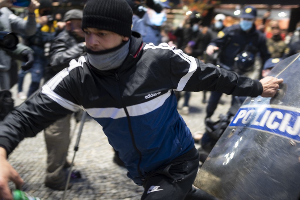 A protestor clashes with police officers during the rally against government’s coronavirus restrictions in Ljubljana on November 5, 2020. Jure Makovec / AFP