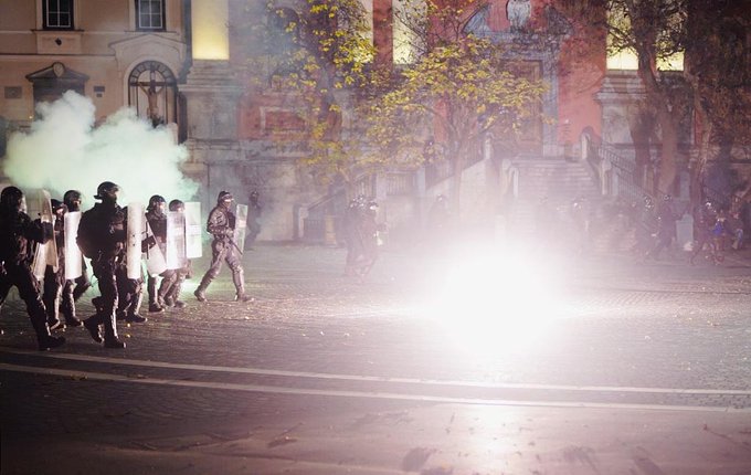 Protesters run through tear gas as they clash with police during the rally against government’s coronavirus restrictions in Ljubljana on November 5, 2020.