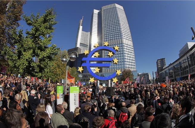 the 'Western' police- handling of riots. Frankfurt -  the Euro-zone's financial hub - joined Europe's mainly peaceful assemblies in voicing objection to the perceived social injustice in the people- versus- banks stand-off.