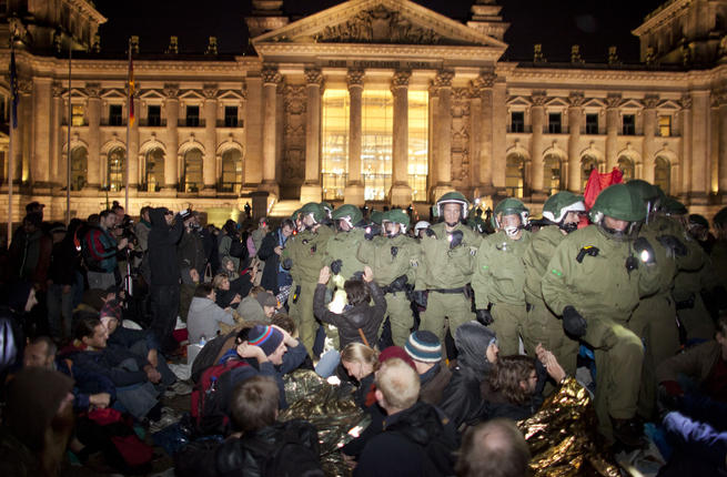 No longer a 'Wall' to occupy or tear down, Berlin keeps the peace, not wishing to give Iran another chance at a quip to the 'Western' police- handling of riots. Frankfurt - the Euro-zone's financial hub - joined Europe's mainly peaceful assemblies in voicing objection to the perceived social injustice in the people- versus- banks stand-off.