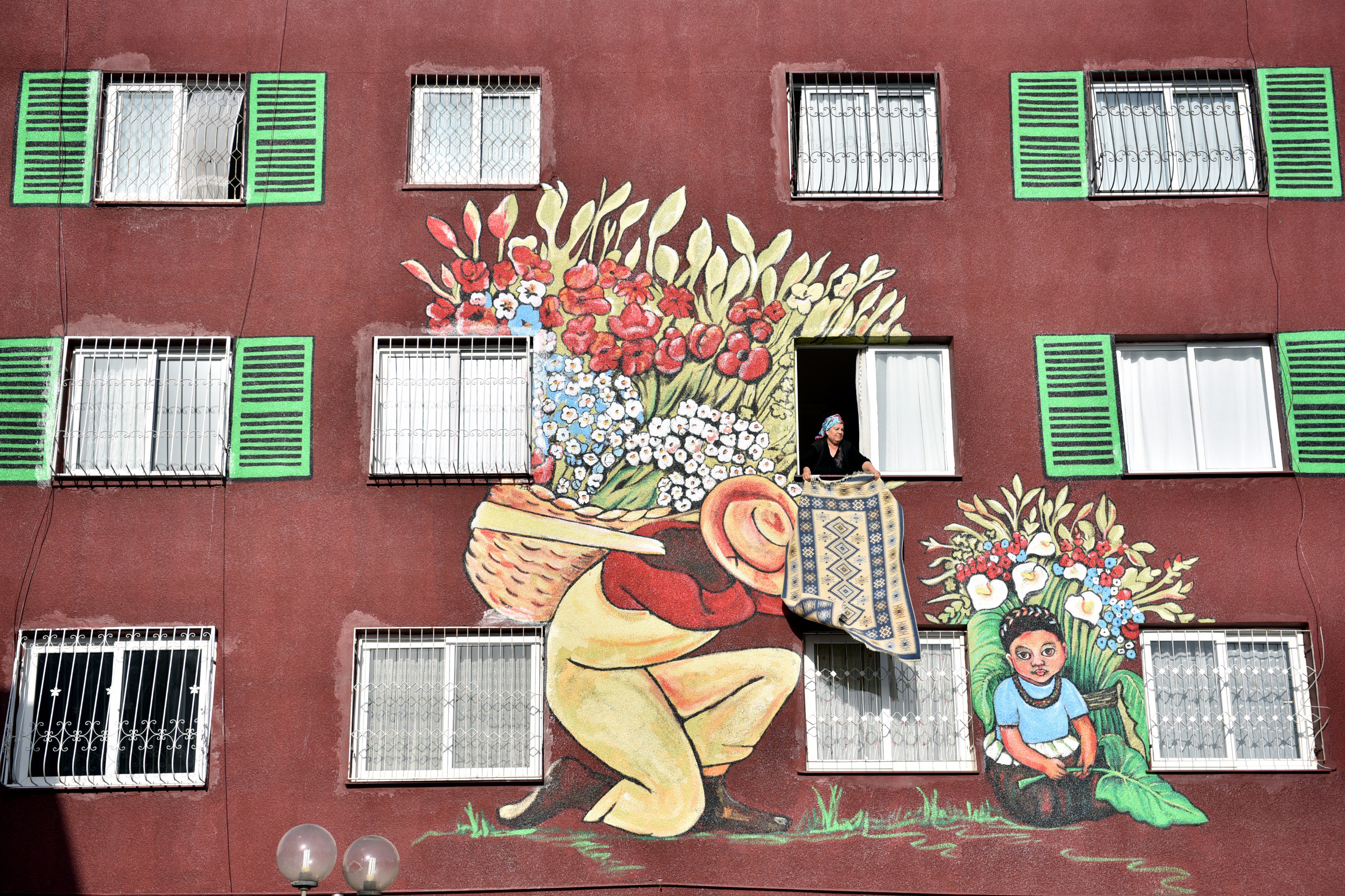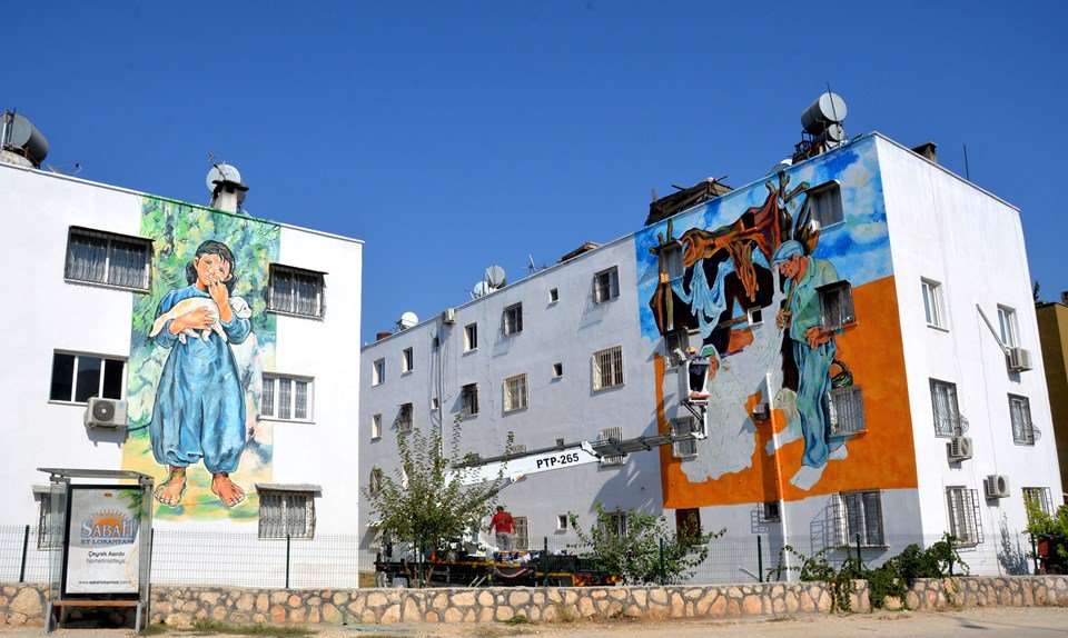 Within the scope of the project launched in Mersin, the walls of the old apartment buildings painted by Nazife Bilgin Hazar are decorated with the works of famous painters. (Twitter/@doganburak29)