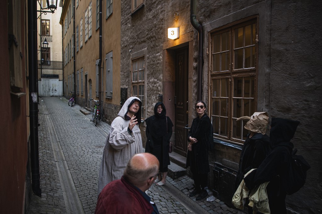Tour guide Mike Anderson takes visitors on May 30 ,2020 on a 'plague walk', taking them around sites in Stockholm's old town related to pandemics of the plague in the 14th and 18th century, and an outbreak of cholera that hit the city in the mid-19th century. Jonathan NACKSTRAND / AFP