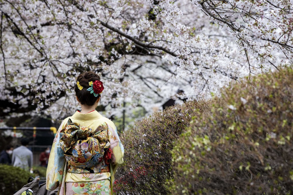 A woman dressed in Japanese traditional kimono poses with cherry blossoms in full bloom in Tokyo on March 28, 2021. Behrouz MEHRI / AFP