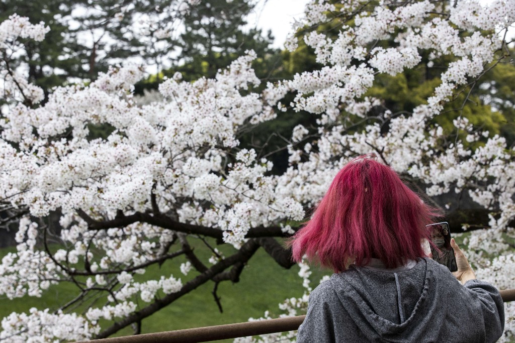 A woman makes a video call next to cherry blossoms in full bloom in Tokyo on March 28, 2021. Behrouz MEHRI / AFP