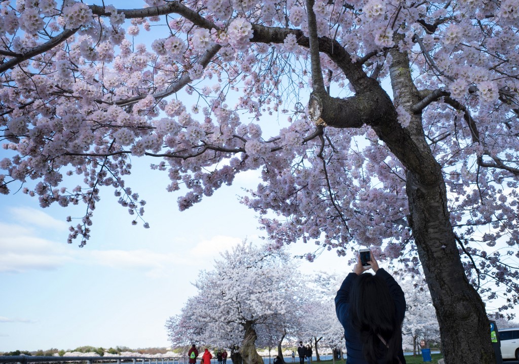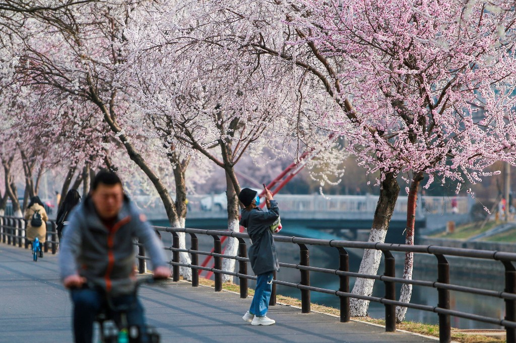 A woman takes photos of cherry blossoms in Shenyang in China's northeastern Liaoning province on April 1, 2021. STR / AFP