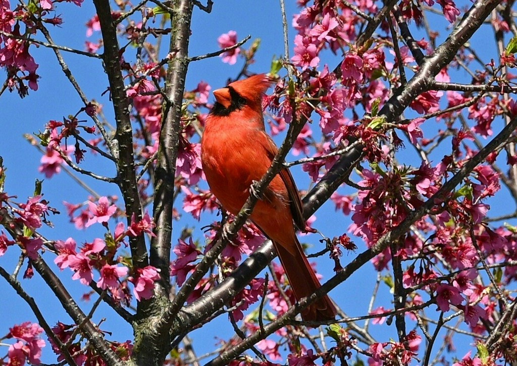 A cardinal sits on the branch of a flowering tree at the National Arboretum in Washington, DC on March 29, 2021. Warm weather over the last few days has led to blossoms blooming earlier than expected. Eva HAMBACH / AFP