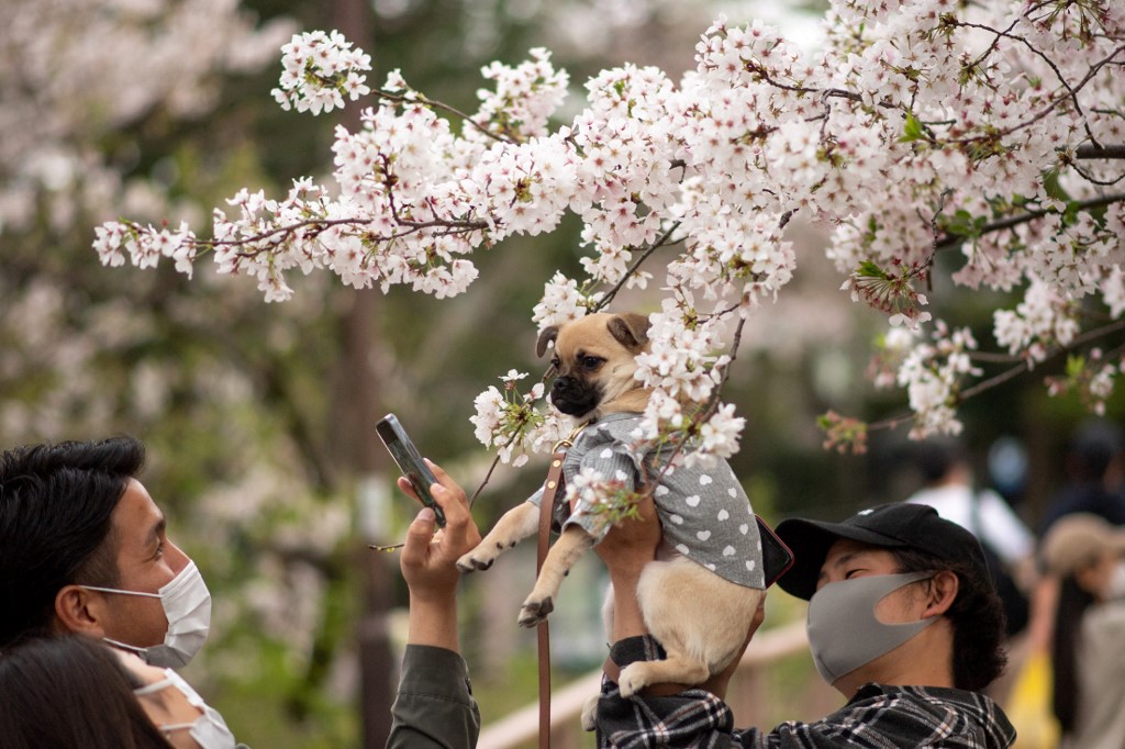A man poses his dog in front of cherry blossoms at Inokashira Park in Tokyo on March 30, 2021. Philip FONG / AFP
