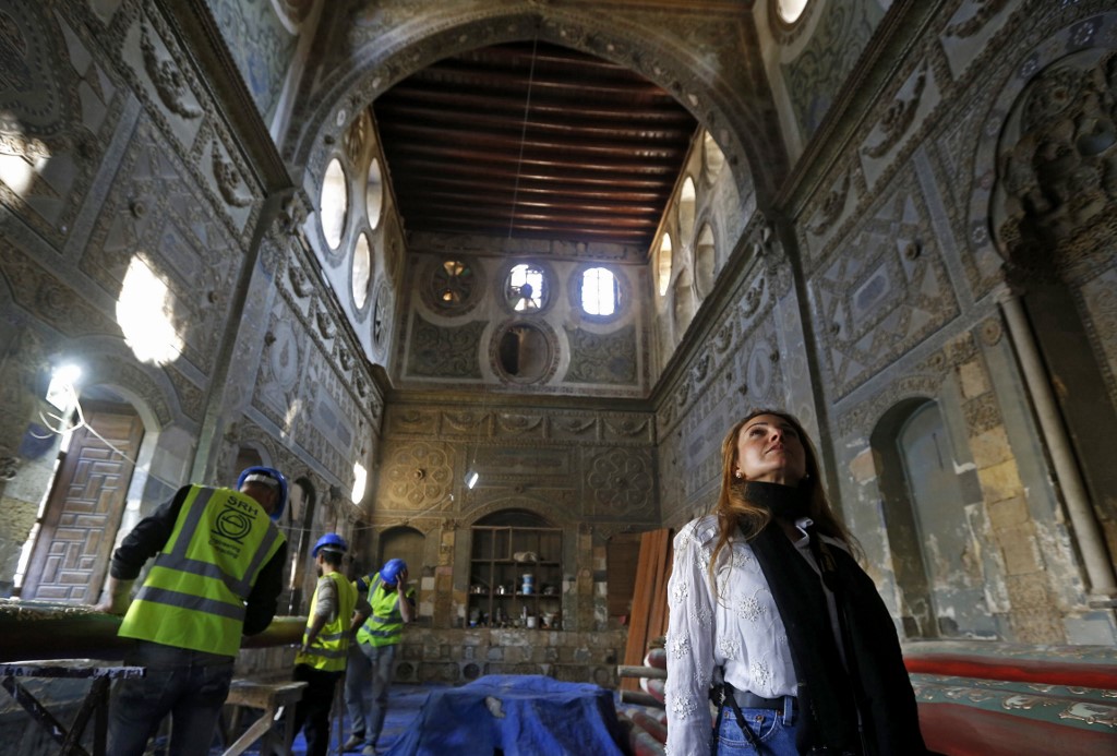 Rania Kataf, 35-year-old Syrian, walks past restoration workers at a palatial Ottoman-era home called Beit al-Quwatli for her digital archive in the old part of Syria's capital Damascus on November 11, 2020. LOUAI BESHARA / AFP