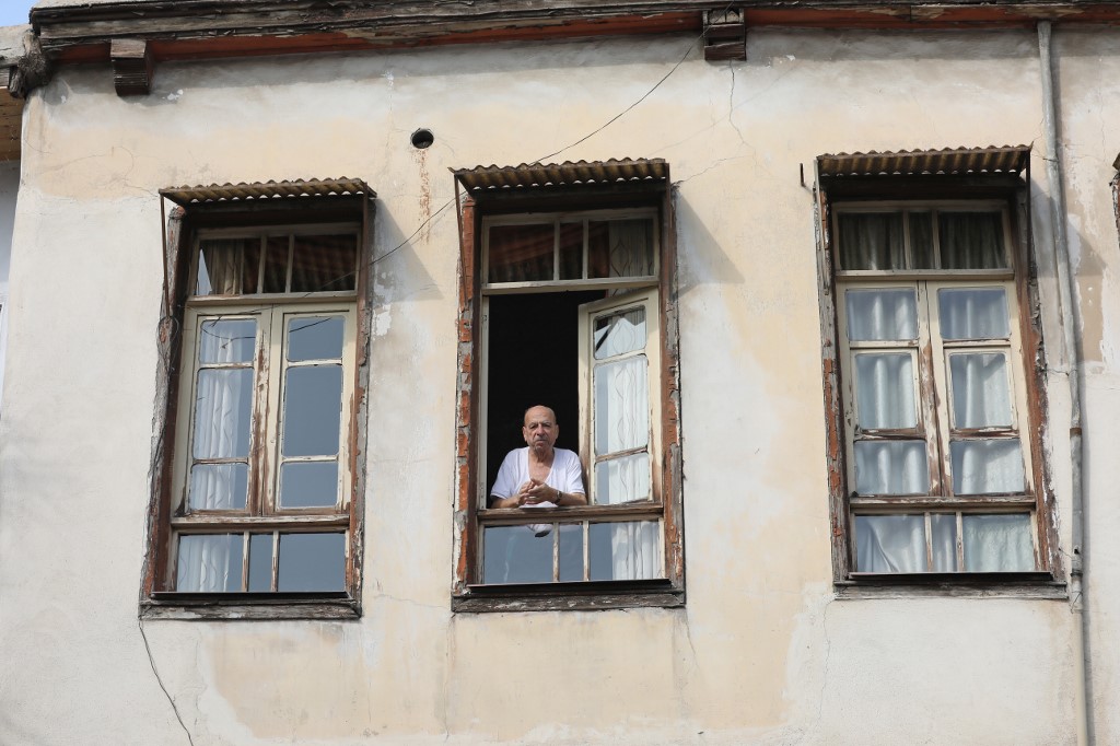 A man looks out the window in the old part of Syria's capital Damascus on October 28, 2020. The old city of the Syrian capital is famed for its elegant century-old houses, usually two storeys built around a leafy rectangular courtyard with a carved stone fountain at its centre. While the capital has been largely spared the violence of Syria's almost ten-year war, several of these traditional homes have been abandoned by their owners or damaged in the conflict. LOUAI BESHARA / AFP