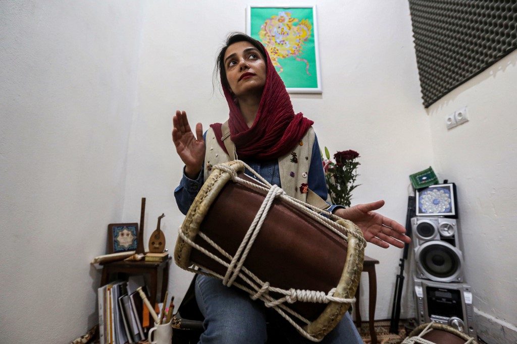 Negin Heydari, a former member of the all-women Iranian music band "Dingo" who plays the kasser drum, poses for a picture as she practises at a home studio called the "Dingo room" in Iran's southern Gulf port city of Bandar Abbas on April 30, 2019. ATTA KENARE / AFP