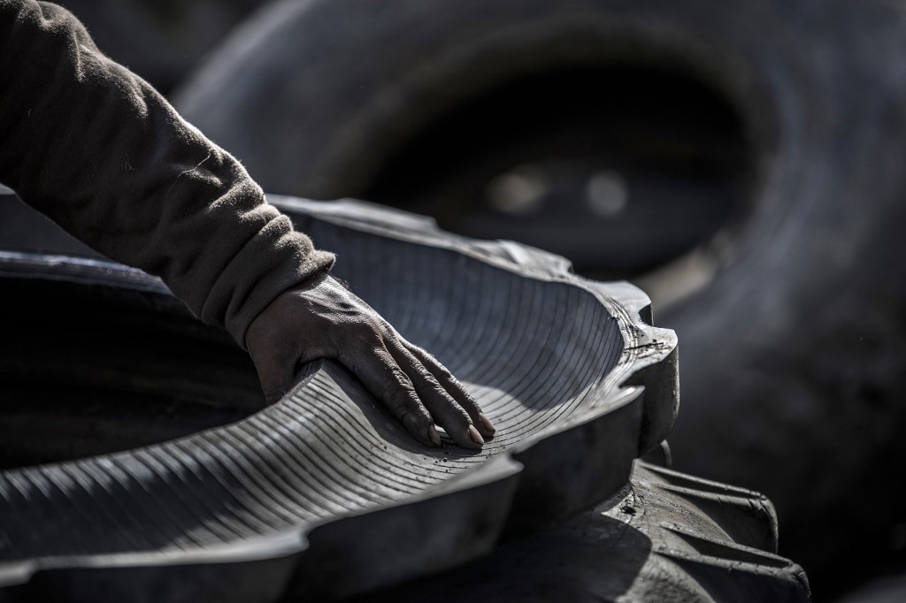 A labourer uses a knife to rip out lining from a tyre at a rubber recycling workshop in the village of Mit al-Harun in Egypt's central Nile delta Gharbia Governorate, about 70 kilometres (43 miles) north of the capital, on January 14, 2020, according to AFP.