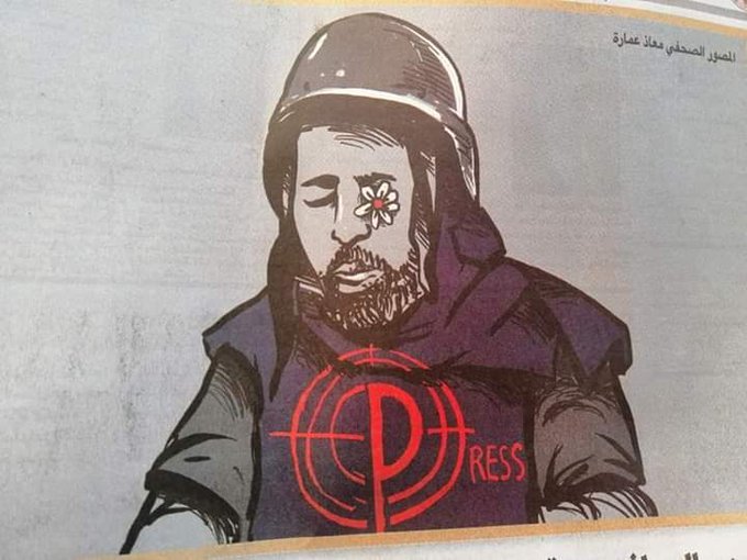Dozens of Palestinian journalists rallied on Sunday - protesting with one eye covered in solidarity, while hundreds more, including celebrities, imitated the move online using the hashtags #MuathEye, #EyeofTruth and #We_are_MuathAmarneh in Arabic.