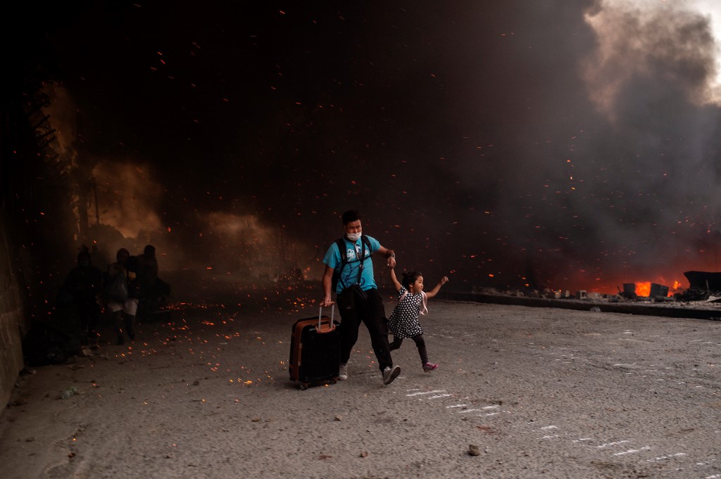The first blaze, which began hours after 35 people tested positive for coronavirus at the Moria camp, sent thousands fleeing for safety into surrounding olive groves -- but nobody was seriously hurt.