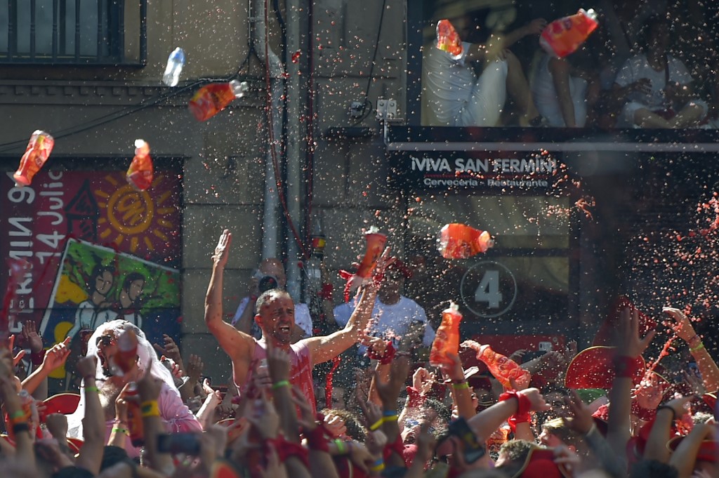 Revellers celebrate during the 'Chupinazo' (start rocket) to mark the kickoff at noon sharp of the San Fermin Festival, in front of the Town Hall of Pamplona, northern Spain, on July 6, 2019. ANDER GILLENEA / AFP
