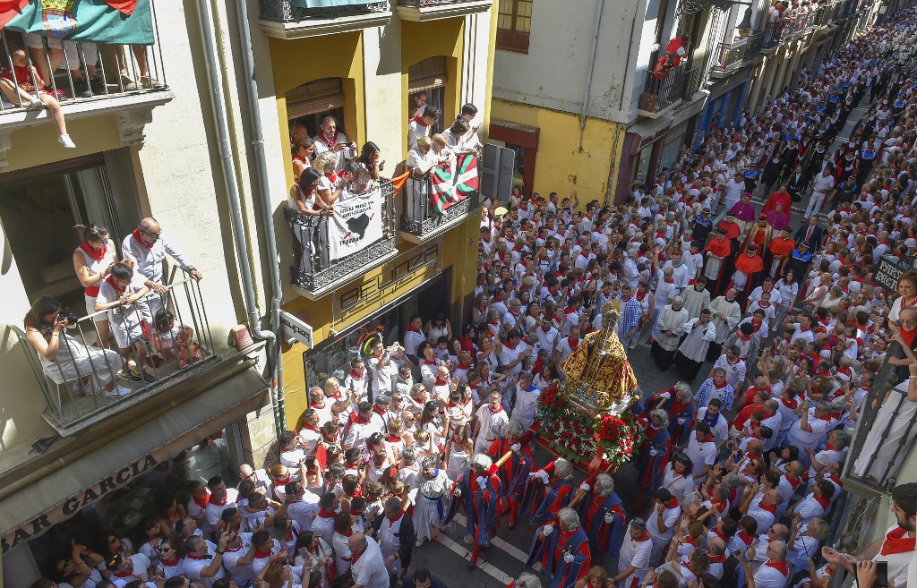 People look at the procession of Pamplona´s patron Saint Fermin on the first day of the San Fermin bullrun festival in Pamplona, northern Spain on July 7, 2019. ANDER GILLENEA / AFP