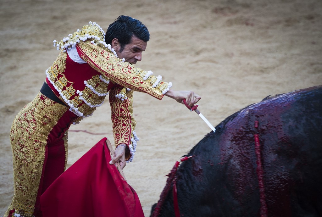 Spanish matador Emilio de Justo stabs a Puerto de San Lorenzo's fighting bull with a sword during the first bullfight of the San Fermin Festival in Pamplona, on July 7, 2019.  JAIME REINA / AFP
