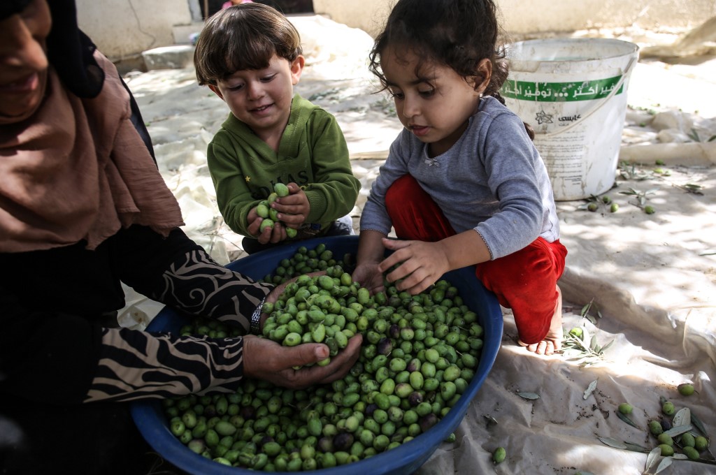 A Palestinian woman and children hold hand full of olives during harvest season at an olive grove in Khan Yunis in the southern Gaza Strip on October 6, 2019. SAID KHATIB / AFP