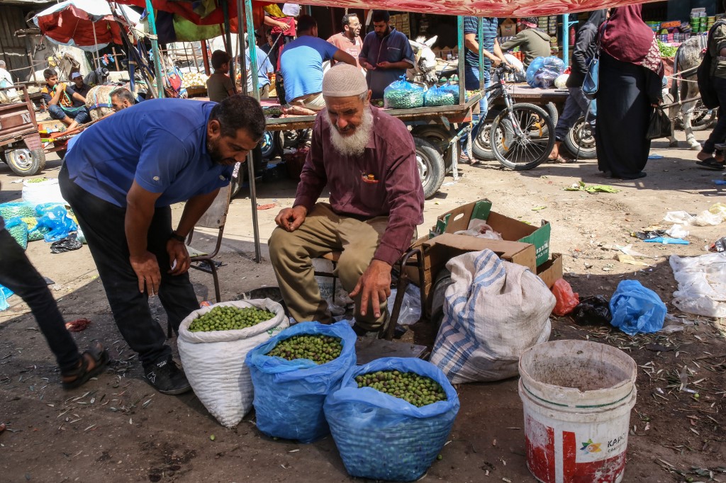 An elderly Palestinian man sell olives at a market during harvest season in Khan Yunis in the southern Gaza Strip on October 6, 2019. SAID KHATIB / AFP
