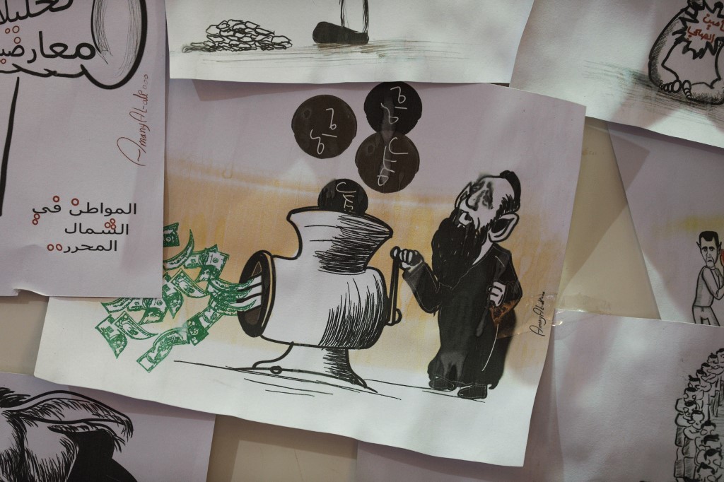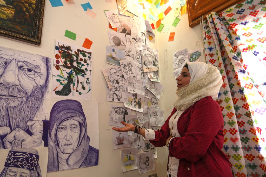 This picture taken on June 16, 2019, shows various illustrations by Syrian Cartoonist Amani al-Ali at her home studio in the city of Idlib in the eponymous northwestern province. Omar HAJ KADOUR / AFP