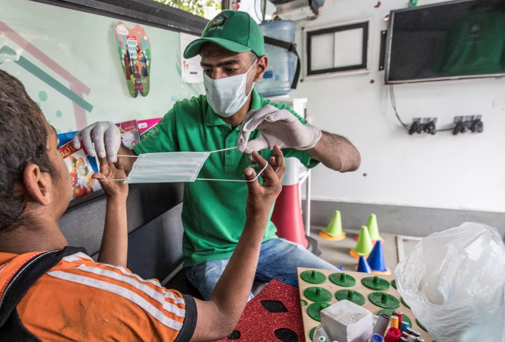 A social worker shows a homeless child the proper way to use a face mask inside one of the mobile units run by the Egyptian authorities and used as part of the "Atfal bala ma'wa" (Children without a home) social program, in the capital Cairo's Abbasia district on June 22, 2020. Khaled DESOUKI / AFP