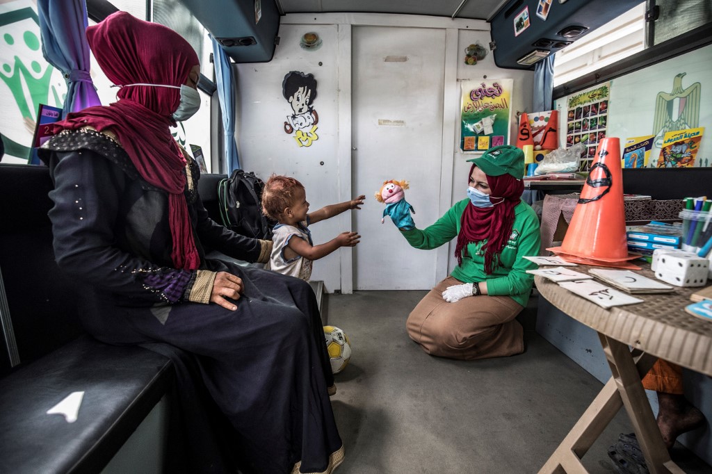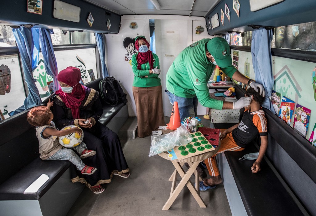 A woman looks on as a worker entertains a homeless child inside one of the mobile units run by the Egyptian authorities and used as part of the "Atfal bala ma'wa" (Children without a home) social program, in the capital Cairo's Abbasia district on June 22, 2020. Khaled DESOUKI / AFP