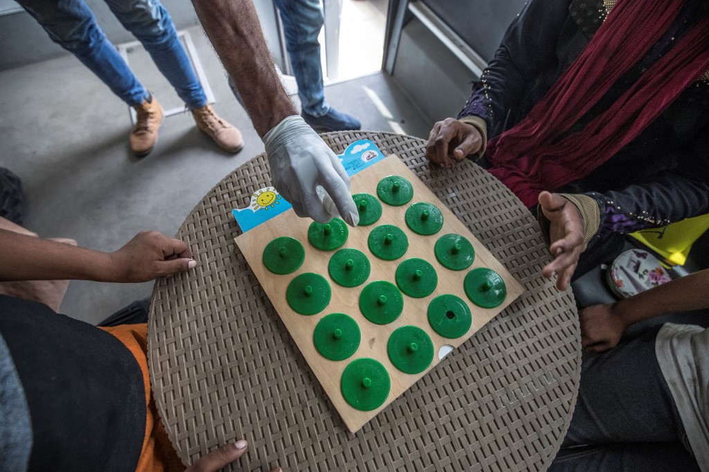 Homeless children play an educational game with a social worker inside one of the mobile units run by the Egyptian authorities and used as part of the "Atfal bala ma'wa" (Children without a home) social program, in the capital Cairo's Abbasia district on June 22, 2020. Khaled DESOUKI / AFP