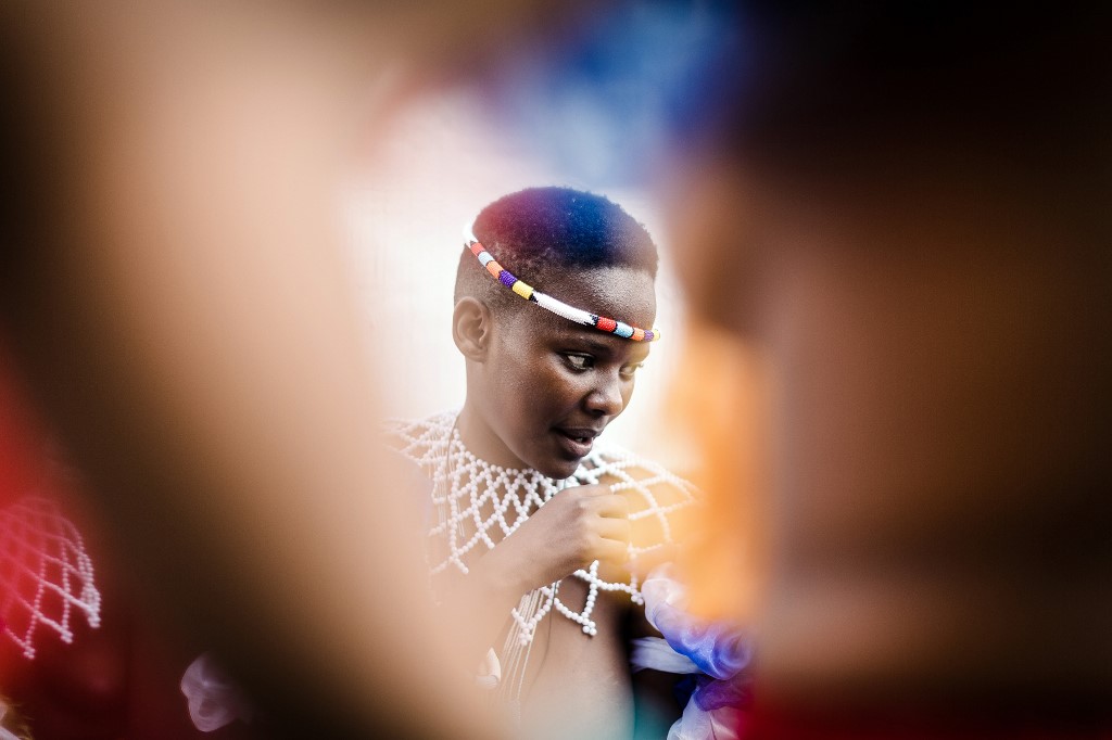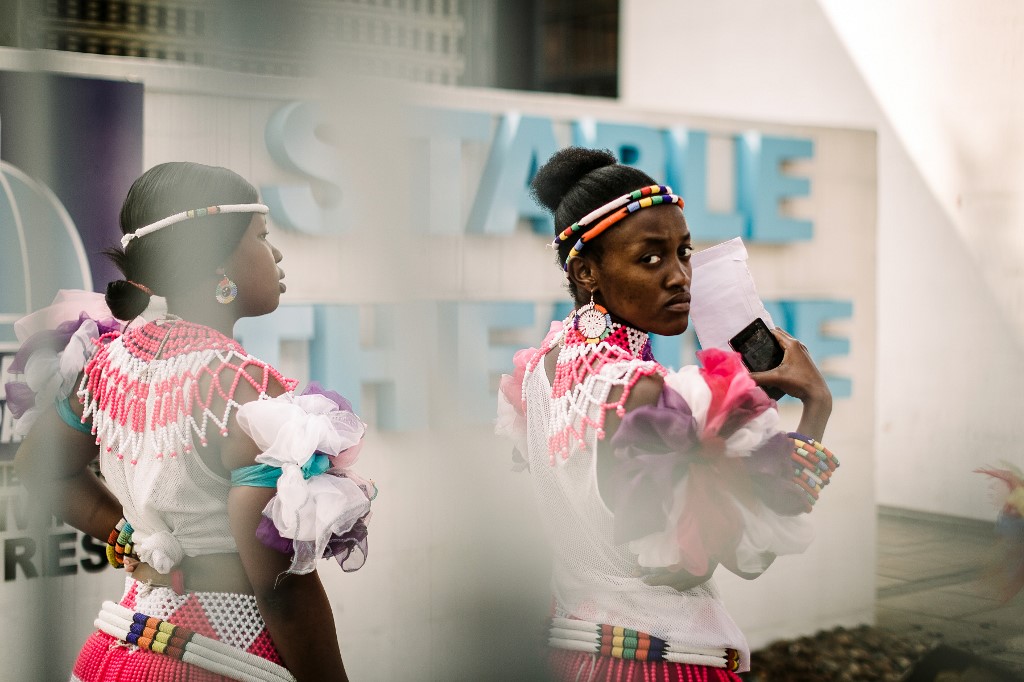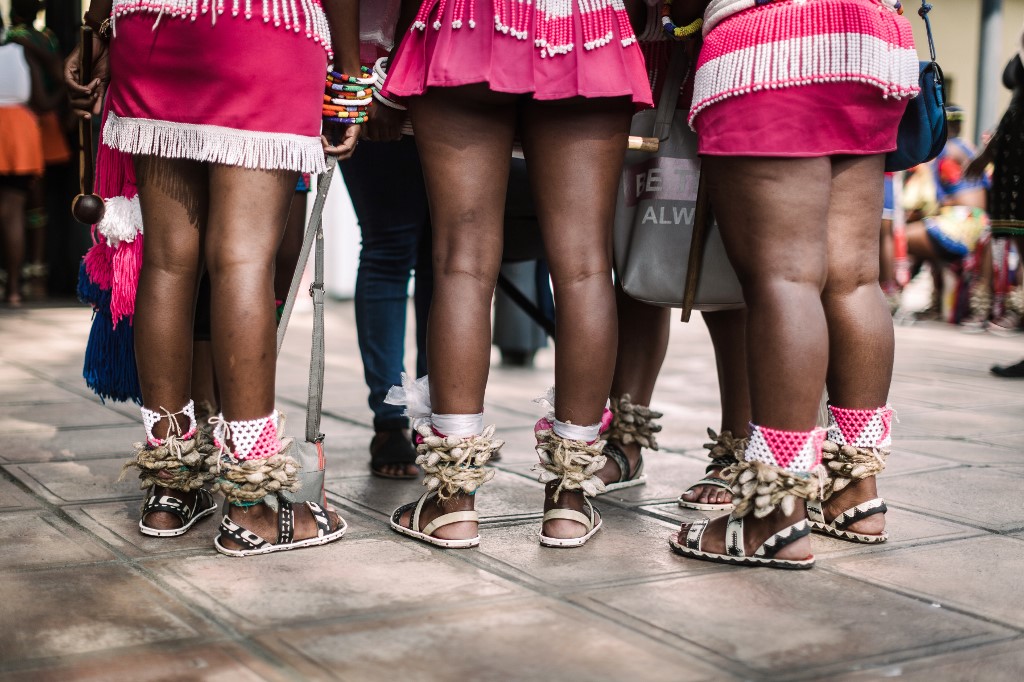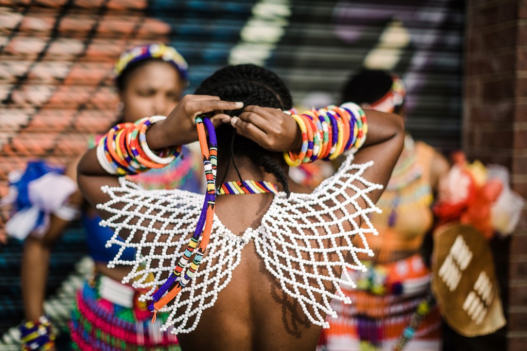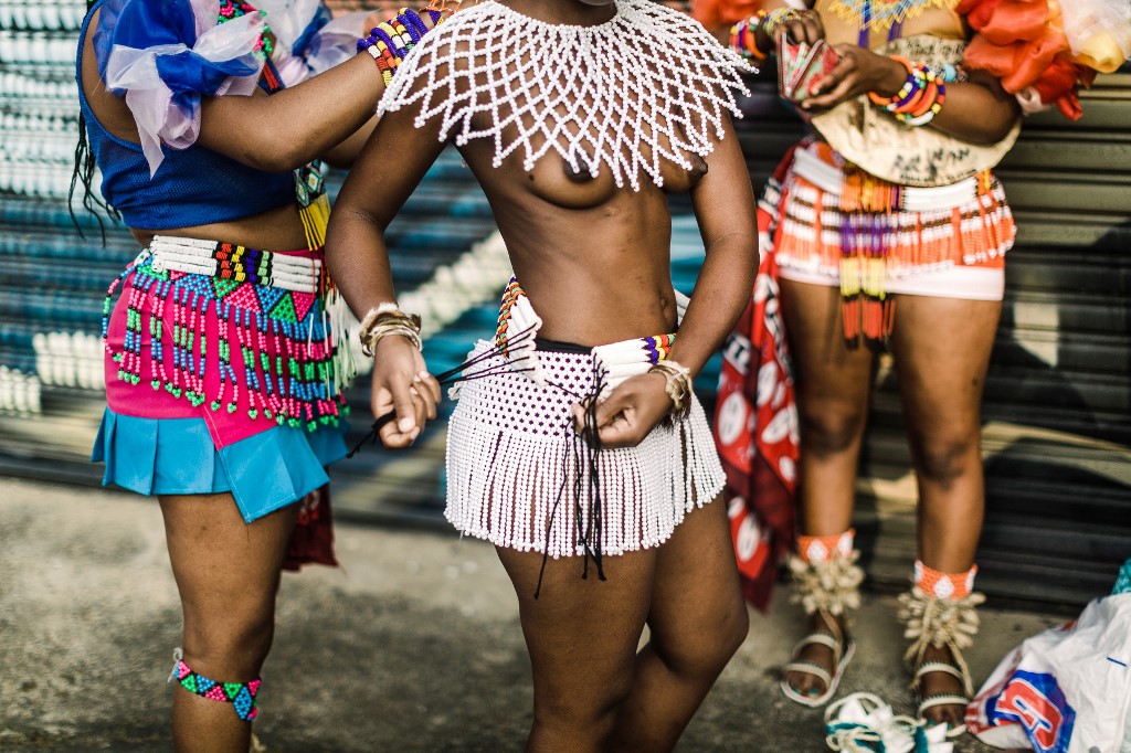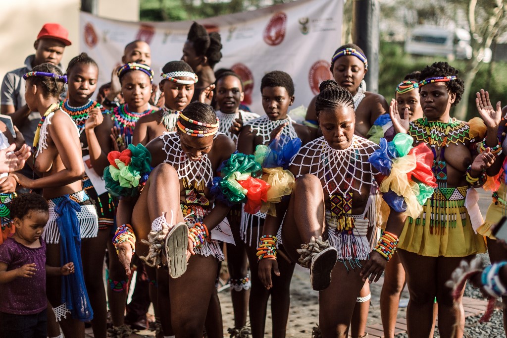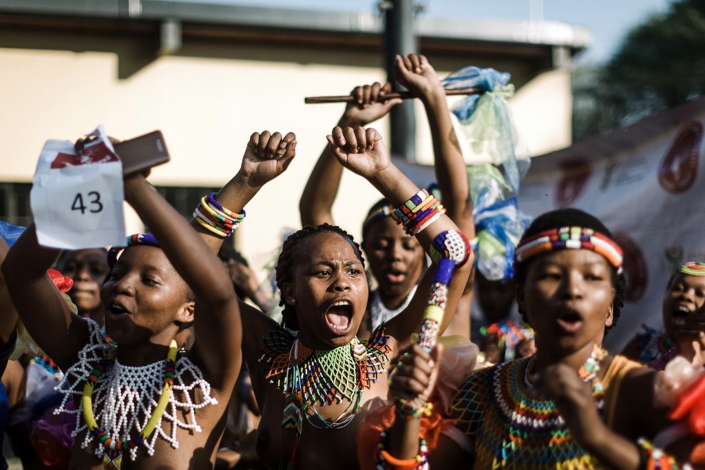 Young women dressed up in traditional attire sing and chant during an audition organised by the Indoni Culture School in the South African.