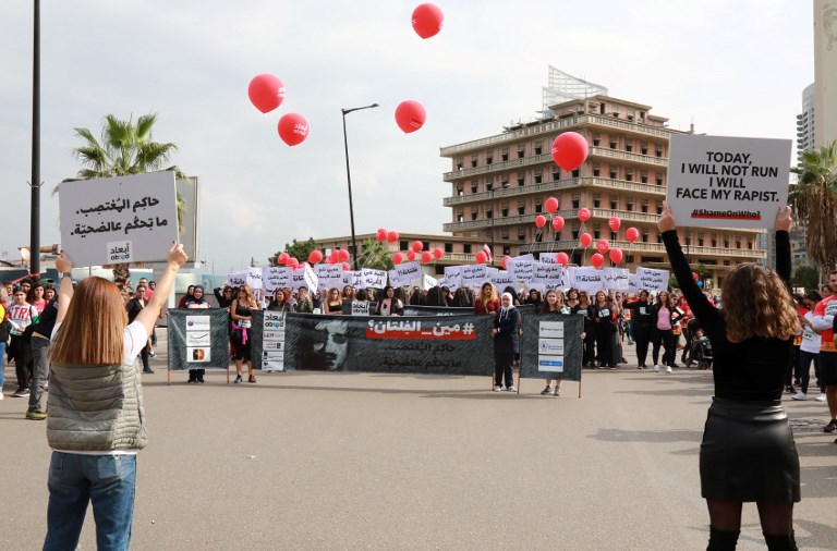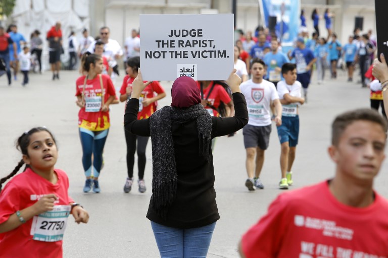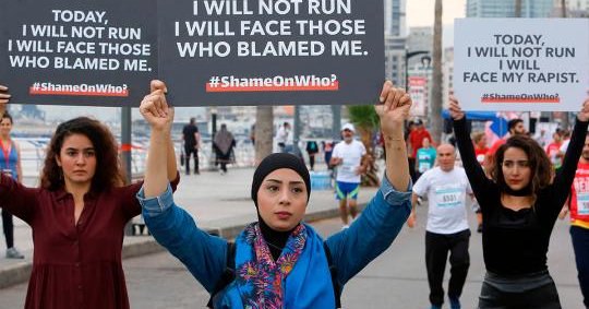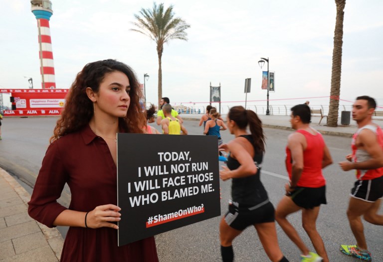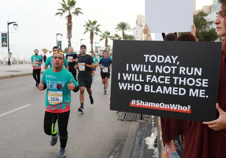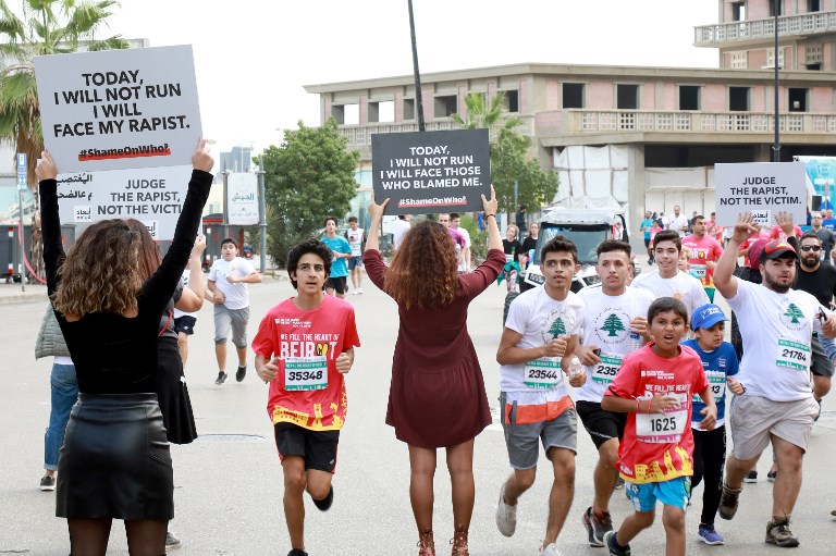 Protesters holding signs reading "I will face my rapist" lined the course of Beirut's Marathon to call for tougher action against sexual abusers.