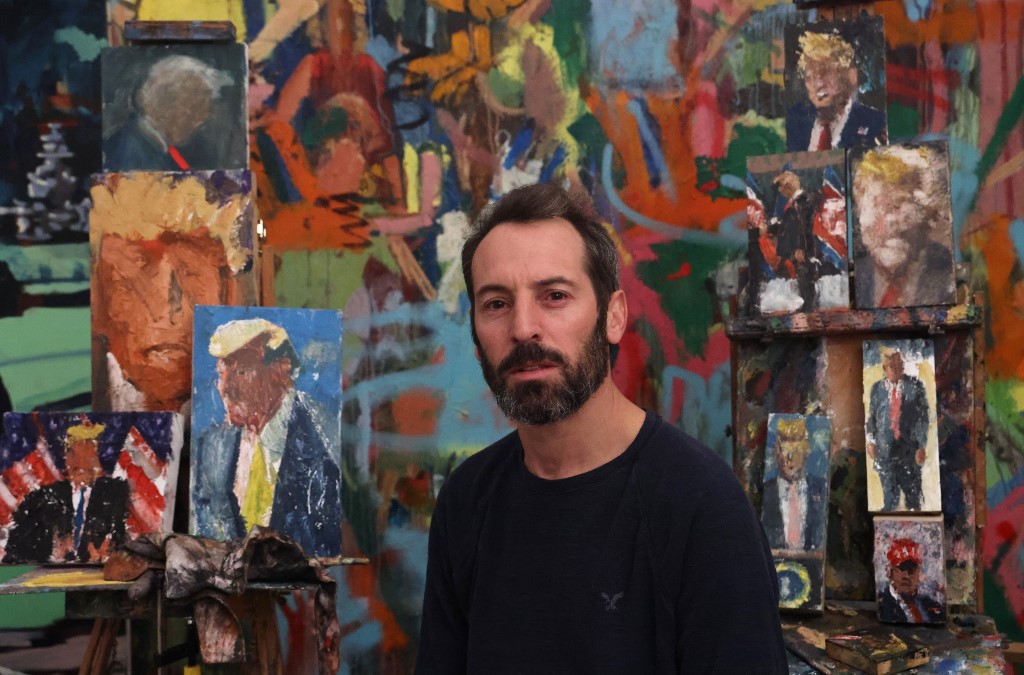 The face is obscure and grim, but the blonde comb-over and tie leave no doubt that the image carpeting the studio of Israeli painter Iddo Markus is that of Donald Trump.