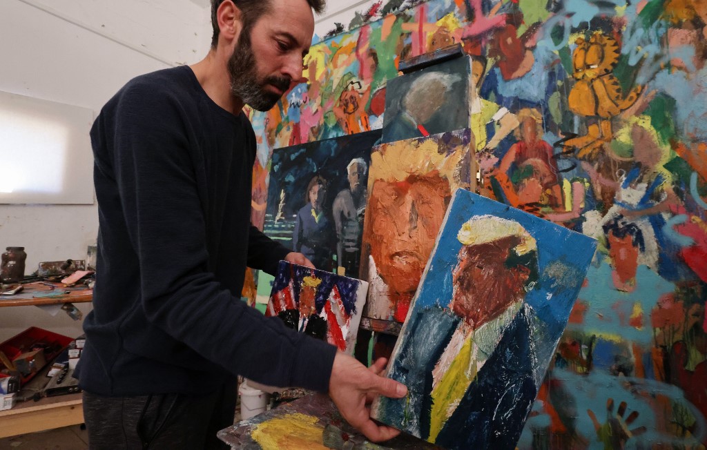 Israeli painter Iddo Markus works at his studio where he displays some of his paintings of former US president Donald Trump, in the northern port city of Haifa, on January 22, 2021. Markus became fascinated by the "tragic figure" of Donald Trump, and the walls and floor of his studio are packed with some 120 portraits of the former US presidents. Emmanuel DUNAND / AFP