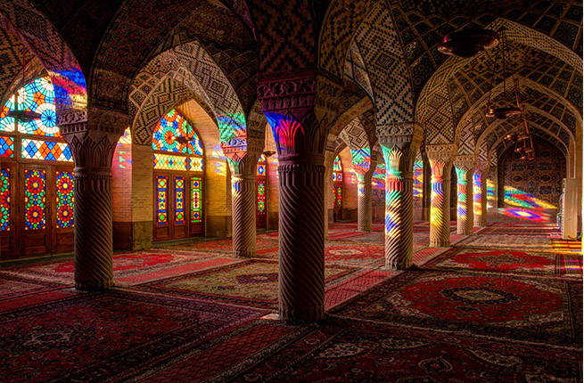 When the rays of the rising sun reach the building (tiled in seven colors!) and pass through its magnificent stained glass windows, the interior of Nasīr al-Mulk is transformed into a mesmerizing kaleidoscope.