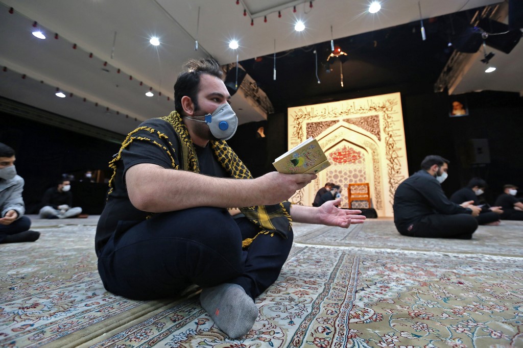 The mask-clad faithful for the most part adhered to social distancing guidelines as they sat in designated areas of Reihanat al-Hussein mosque, in west Tehran.