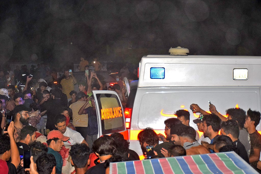 People gather near an ambulance as a massive fire engulfs the coronavirus isolation ward of Al-Hussein hospital in the southern Iraqi city of Nasiriyah, late on July 12, 2021. Asaad NIAZI / AFP