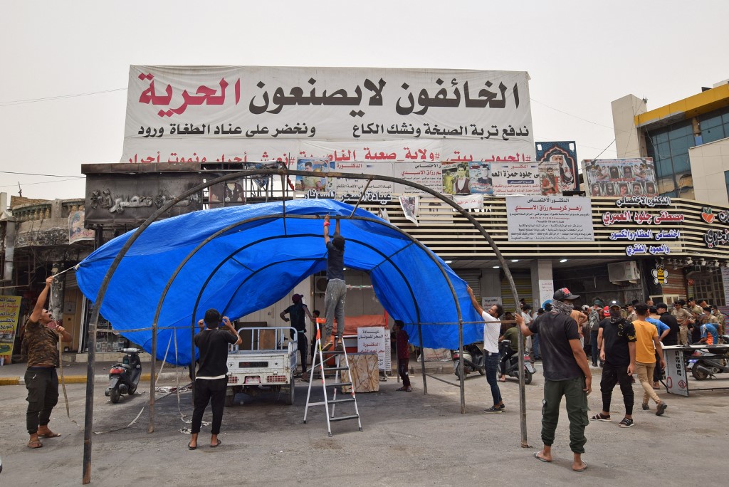 Iraqi protesters erect a tent at al-Haboubi Square in the southern city of Nasiriyah in Dhi Qar province on July 13, 2021, after fire swept through a Covid isolation unit killing 64 people and wounding dozens more in the city's Al-Hussein Hospital. The devastating blaze, which medics said was fuelled by the explosion of oxygen canisters, was the second such fire in Iraq in three months. Asaad NIAZI / AFP