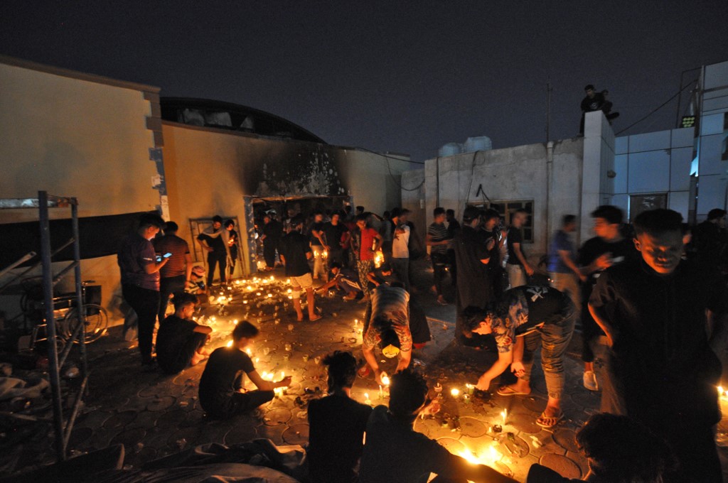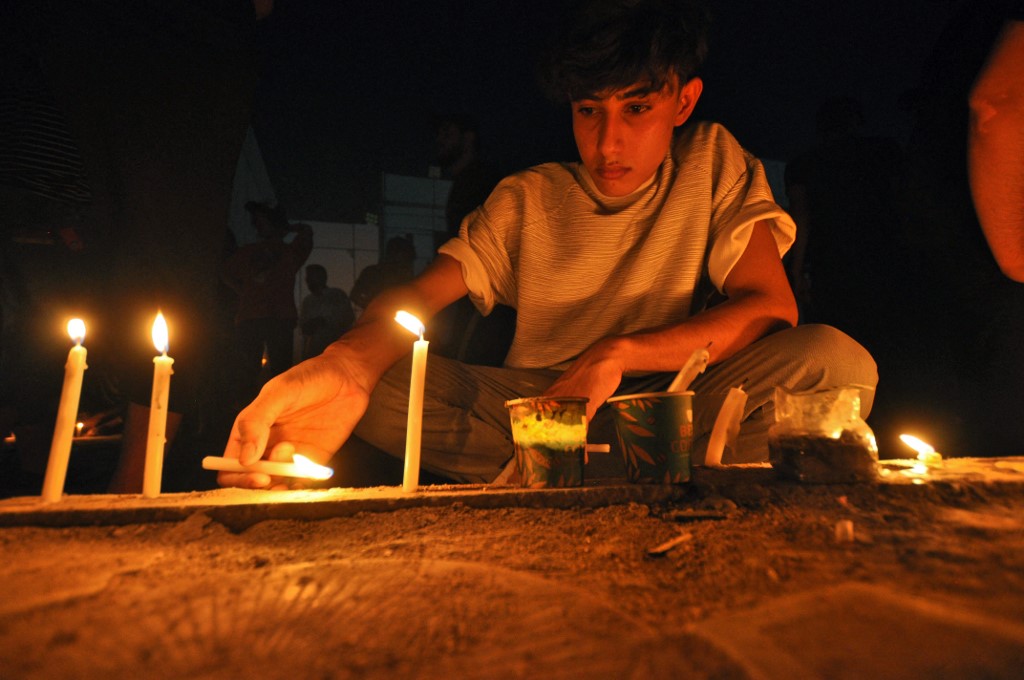 People light up candles for a vigil in mourning for the victims of a fire that swept through a COVID-19 coronavirus isolation unit killing over 60 people and wounding dozens more, at al-Hussein Hospital in Iraq's southern city of Nasiriyah in Dhi Qar province on July 13, 2021. Asaad NIAZI / AFP