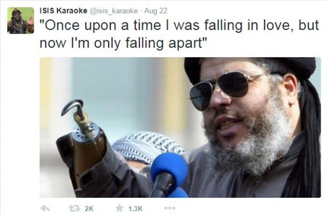 Here’s a pitch perfect way to parody terror that empowers people too. The idea behind a new Twitter feed called ISIS Karaoke couldn’t be simpler. Grab an image of a terrorist (or any advocate of hate) gripping a microphone, pair it with a Western pop song lyric, and create comedy haiku that instantly satirizes an otherwise somber situation. Then send the silly couplets flying ‘round on social media. Watch each resulting giggle deflate demonic dreadfulness.