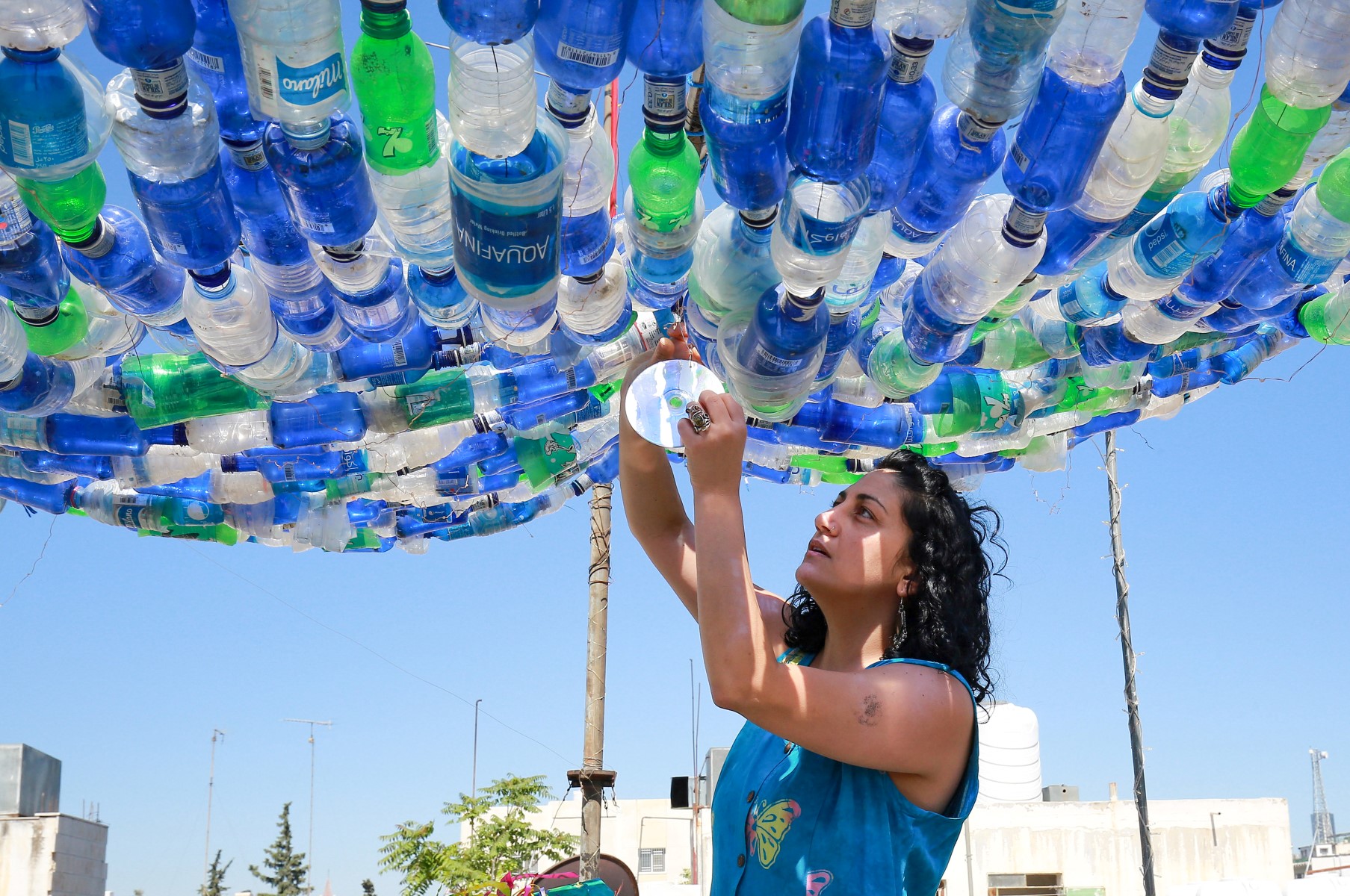 Maria Nissan, an environmental activist and artist, works on one of her art pieces created from plastic waste collected from the streets,in the Jordanian capital Amman, on May 17, 2022. Nissan, 35, an American of Iraqi origin, turns plastic waste into art in an effort to raise the awareness of single-use plastics' problem in Jordan. (Photo by Khalil MAZRAAWI / AFP)