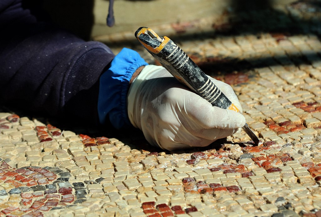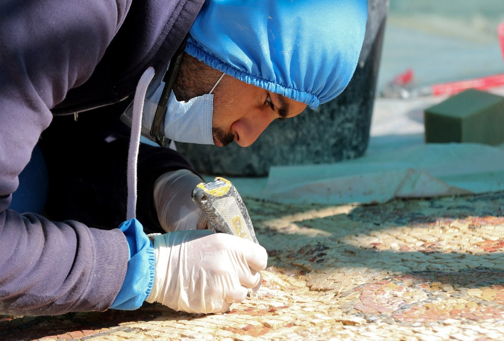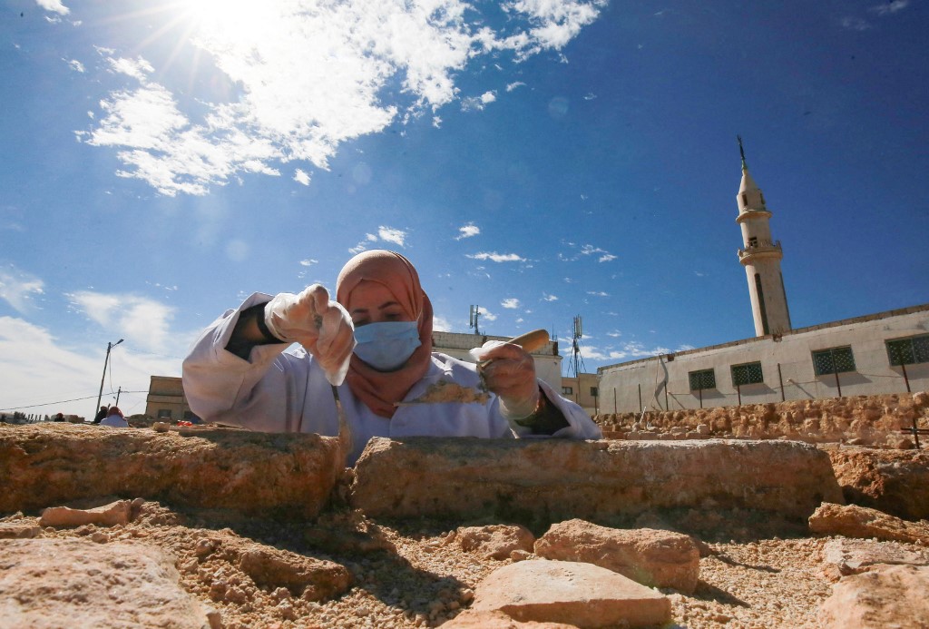 A worker employed by a pilot project run by the UN cultural agency UNESCO, restores a mosaic floor at an ancient church complex, in the small town of Rihab, some 70 kilometres north of the Jordanian capital Amman, on February 9, 2021. In the ruins of the ancient Byzantine church in Jordan, local townspeople and Syrian refugees work side by side on a project that unites preserving cultural heritage and fighting poverty. Khalil MAZRAAWI / afp
