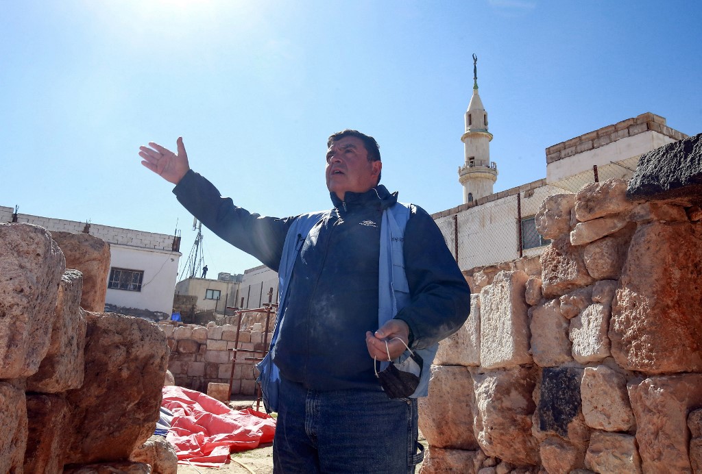 Franco Sciorilli, an Italian expert, speaks to AFP as he supervises workers employed by a pilot project run by the UN cultural agency UNESCO, to restore an ancient church complex, in the small town of Rihab, some 70 kilometres north of the Jordanian capital Amman, on February 9, 2021. In the ruins of the ancient Byzantine church in Jordan, local townspeople and Syrian refugees work side by side on a project that unites preserving cultural heritage and fighting poverty. Khalil MAZRAAWI / afp