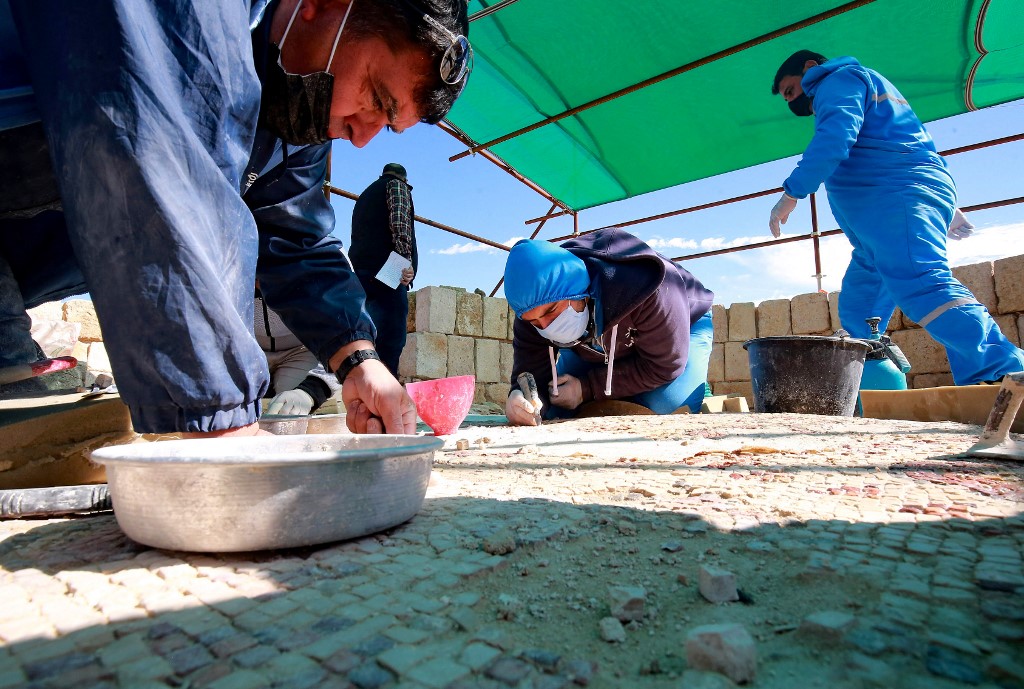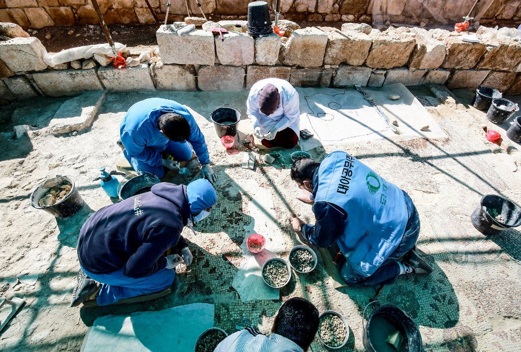 Workers employed by a pilot project run by the UN cultural agency UNESCO, restore a mosaic floor at an ancient church complex, in the small town of Rihab, some 70 kilometres north of the Jordanian capital Amman, on February 9, 2021. In the ruins of the ancient Byzantine church in Jordan, local townspeople and Syrian refugees work side by side on a project that unites preserving cultural heritage and fighting poverty.  Khalil MAZRAAWI / afp