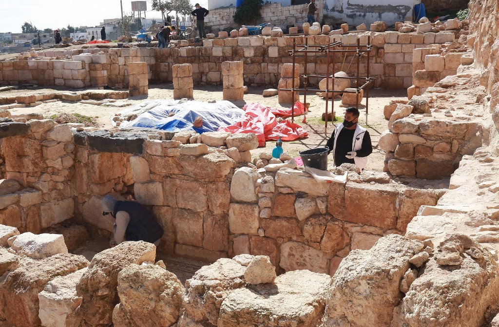 Workers employed by a pilot project run by the UN cultural agency UNESCO, restore a mosaic floor at an ancient church complex, in the small town of Rihab, some 70 kilometres north of the Jordanian capital Amman, on February 9, 2021. In the ruins of the ancient Byzantine church in Jordan, local townspeople and Syrian refugees work side by side on a project that unites preserving cultural heritage and fighting poverty. Khalil MAZRAAWI / afp