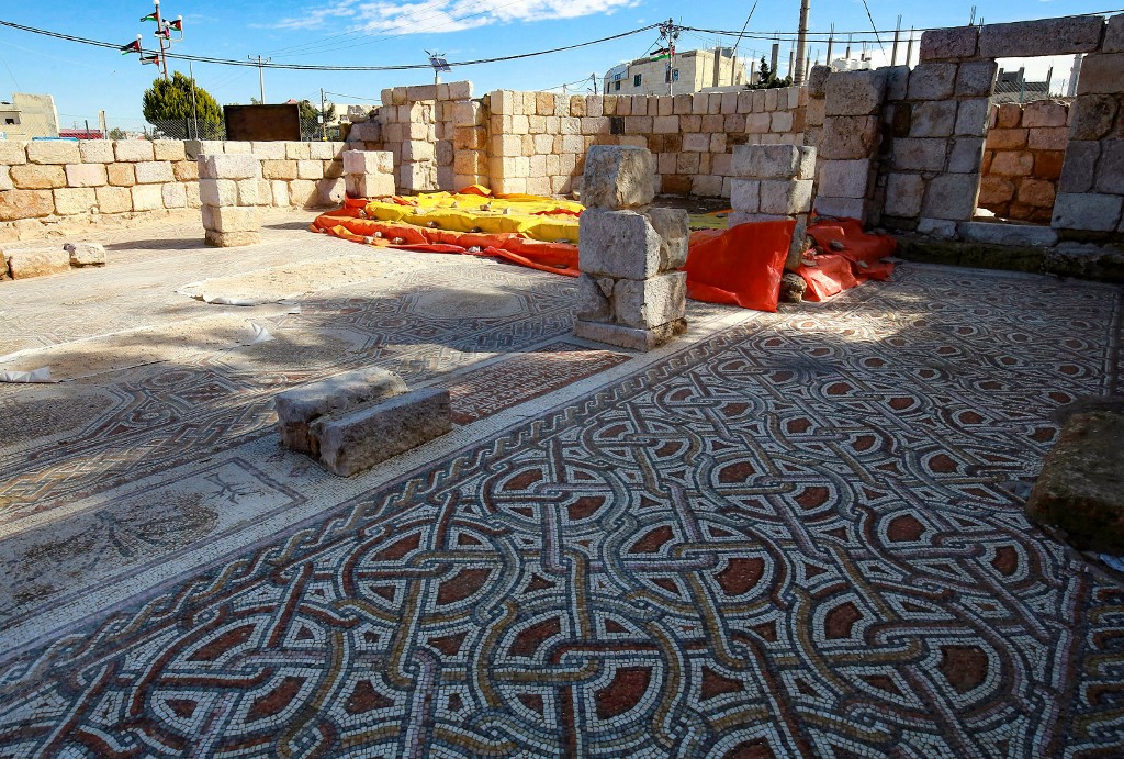 This picture shows the mosaic flooring of the Saint Mary church, built in 543 AD, the restoration of which was recently completed by workers employed by a pilot project run by the UN cultural agency UNESCO, in the small town of Rihab, some 70 kilometres north of the Jordanian capital Amman, on February 9, 2021. In the ruins of the ancient Byzantine church in Jordan, local townspeople and Syrian refugees work side by side on a project that unites preserving cultural heritage and fighting poverty.  Khalil MAZ